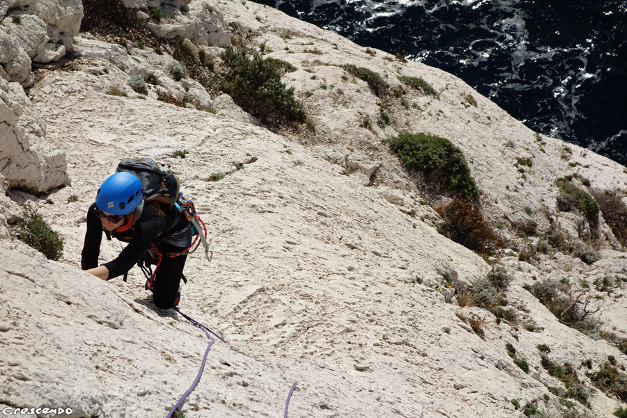 Comme beaucoup de voies dans ces secteurs de la Calanque de Sormiou (Dièdre Guem, Rumpe Cuou…) l’Hallu Nulle est une voie très accessible sur un rocher blanc sculpté, dans une ambiance maritime mais pas oppressante, avec une vue sur le large et les iles… beaucoup d’avantages pour une initiation/découverte ou bien un perfectionnement vers l’autonomie en grande voie qui laisse des traces!